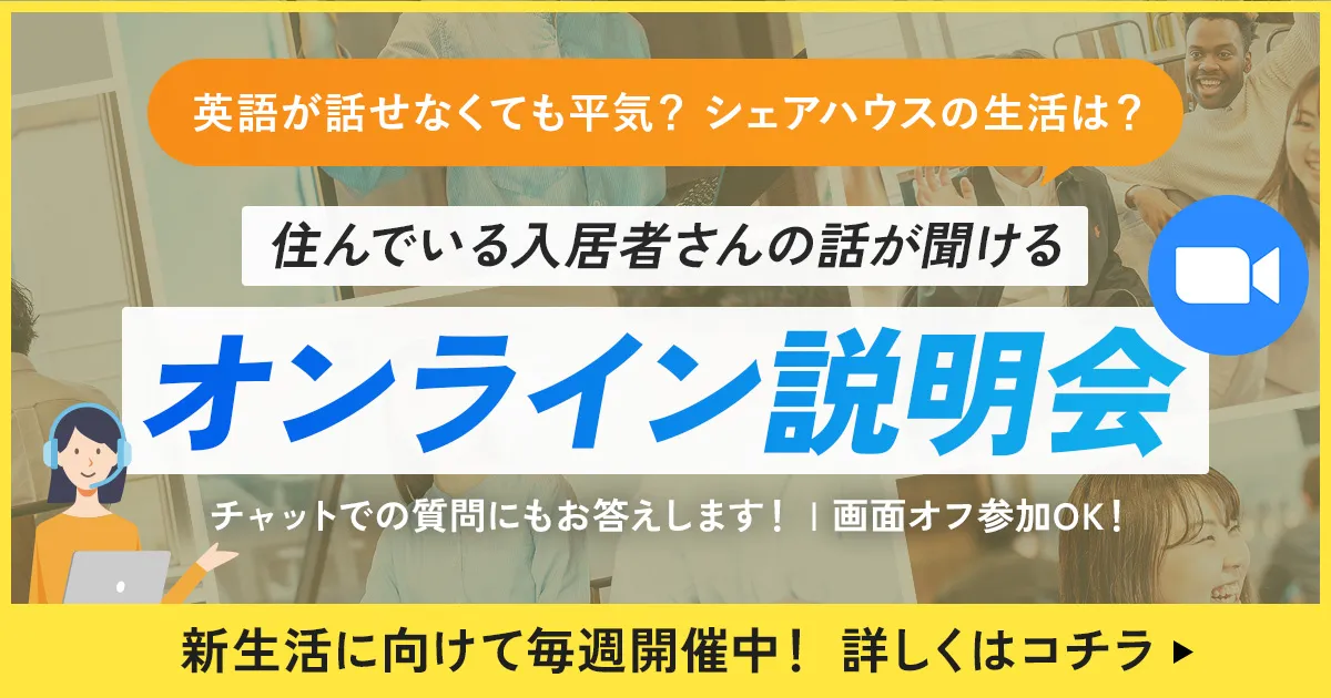 ※現在空室の部屋にお申し込みの場合、お申し込み日から遅くとも2週間後からの賃料発生、空室予定のお部屋にお申し込みの場合、空室予定日から遅くとも2週間後からの賃料発生となります。 - 英語や現地の言葉が話せなくても大丈夫ですか?ボーダレスハウス 日本英語や現地の言葉をまだ勉強し始めたばかりの方、海外経験のない方も多くボーダレスハウスに入居されています。また、海外から来る方は、その国に興味があったり、言語を勉強している方ばかり。ときには他の現地のハウスメイトに助けてもらうこともできますし、入居後に上達していく方も多いので、安心してご入居ください!ボーダレスハウス 韓国英語や現地の言葉をまだ勉強し始めたばかりの方、海外経験のない方も多くボーダレスハウスに入居されています。また、海外から来る方は、その国に興味があったり、言語を勉強している方ばかり。ときには他の現地のハウスメイトに助けてもらうこともできますし、入居後に上達していく方も多いので、安心してご入居ください!ボーダレスハウス 台湾英語や現地の言葉をまだ勉強し始めたばかりの方、海外経験のない方も多くボーダレスハウスに入居されています。また、海外から来る方は、その国に興味があったり、言語を勉強している方ばかり。ときには他の現地のハウスメイトに助けてもらうこともできますし、入居後に上達していく方も多いので、安心してご入居ください!