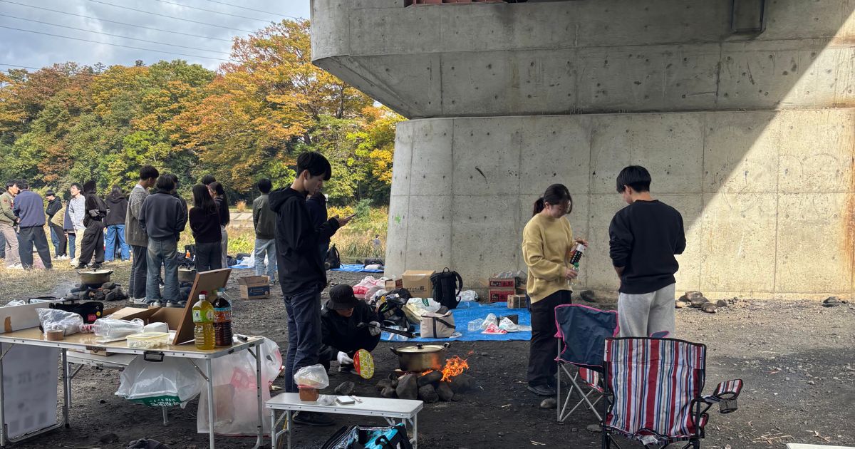 これは河川敷で芋煮をしている様子の写真です。日本人メンバーが外国籍メンバーに芋煮を振舞うために準備をしています!多国籍の人たちで地元料理をほおばっている様子を見た地元テレビ局が、私たちを取材してくれたことはいい思い出です。