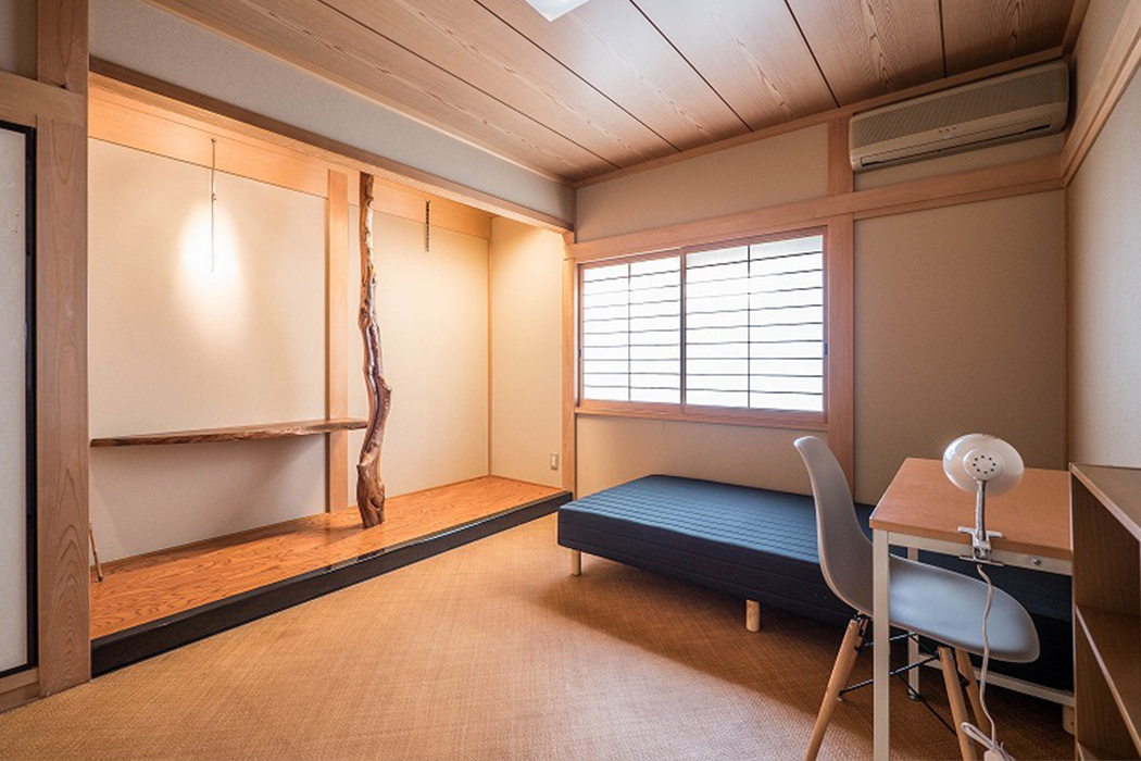 - 改修工事を行い全て個室にし、水回りやリビングを作り長期宿泊者向けのホテルに変更。ホテル×長期宿泊に高収益化を実現。1階はカフェバーとして活用し物件自体のコンセプト構築を行う。