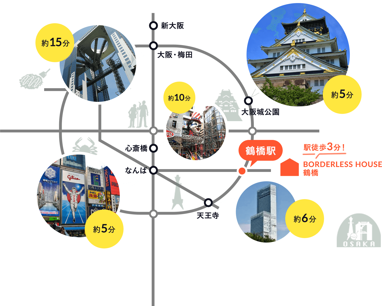 ボーダレスハウス大阪鶴橋1の最寄駅は、その名のとおり鶴橋駅。JR大阪環状線、大阪メトロ千日前線、近鉄線が通る便利な駅なので、なんばや天王寺までは10分以内、大阪駅までも15分でアクセスできちゃいます!また、近鉄線を利用すれば、奈良県・三重県などへも遊びに行けるので、少し足を伸ばして観光を楽しむにも最適ですよ。