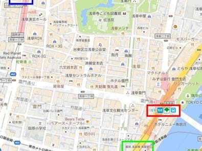 赤枠で囲われた東京メトロ銀座線、東武鉄道伊勢崎線浅草駅と緑枠で囲われている都営浅草線浅草駅は比較的近いのですが、徒歩で2分ほど離れた場所にあります。青枠で囲われたつくばエクスプレスの止まる浅草駅は銀座線浅草駅から徒歩10分ほど離れているため、使う路線によっては注意が必要です。